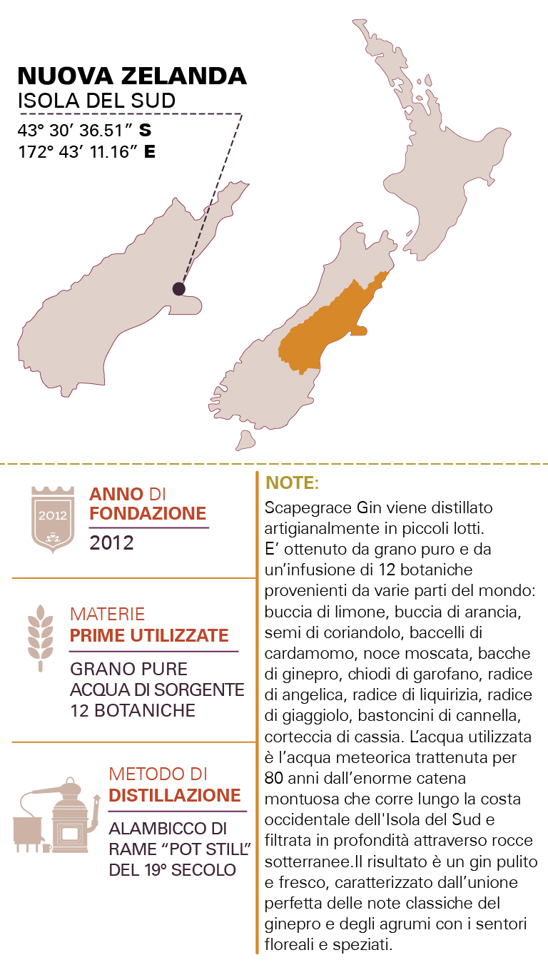 ZONA PRODUTTIVANuova Zelanda MATERIA PRIMAPinot Grigio prodotto dalla cantina Prophet’s Rock (Central Otago), botaniche locali e alcol base dei distillati Scapegrace. Botaniche: Fiori di sambuco, timo selvatico, dente di leone, kanuka e pompelmo DISTILLAZIONEFermentazione spontanea, infusione delle botaniche in alcol e successiva miscelazione. COLOREBrillante PROFUMOL’aroma è secco e complesso con rimandi freschi agli agrumi, ricordi erbacei di fiori di sambuco e sottobosco. ABBINAMENTIEstremamente versatile, da provare liscio con ghiaccio, insieme a sodati e toniche oppure nei cocktail classici. SAPOREIl sorso è pulito e dolce, con un’acidità equilibrata e note floreali zuccherate. Il finale è legnoso e amaro, con in evidenza il timo selvatico e assenzio. NOTEScapegrace è la realizzazione del sogno di due ragazzi che si sono conosciuti dopo che uno sposò la sorella dell’altro: la loro passione per il Gin li ha portati a girare bar e lounge, discutendo su quello che sarebbe stato il loro distillato. Scapegrace Gin viene distillato artigianalmente in piccoli lotti: è ottenuto da grano puro e infusione di botaniche provenienti da tutto il mondo. Oltre ai INVECCHIAMENTOInvecchiamento in legno per 10 mesi.