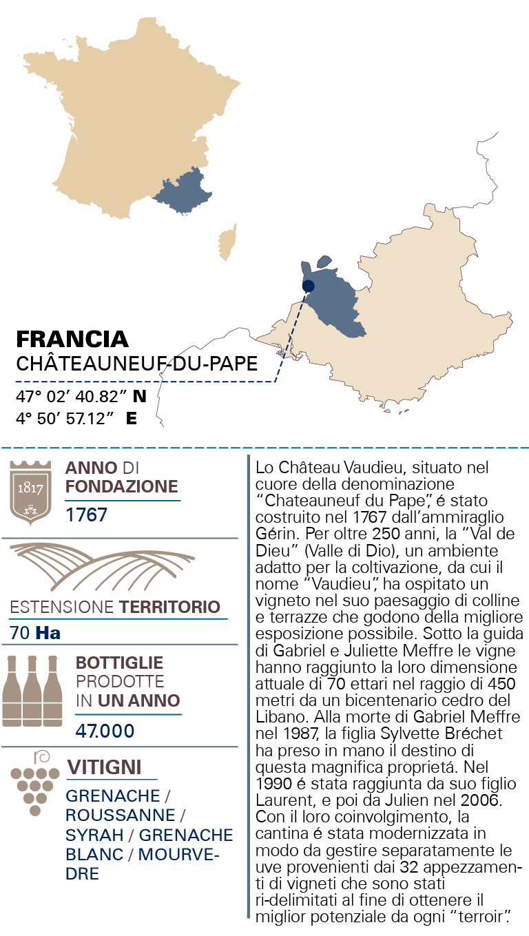 TIPOLOGIAAOC Châteauneuf du Pape ZONA PRODUTTIVAChâteauneuf du Pape VITIGNO75% Grenache, 25% Syrah TIPOLOGIA DEL TERRENOArgille rosse e ciottoli VINIFICAZIONEFermentazione alcolica a 25 °C, seguita da una macerazione "ad infusione", con fermentazione sulle fecce e un delicato rimontaggio. COLORERosso rubino profondo PROFUMOIl naso rivela una sottile miscela di lampone e fava di cacao, seguita da note di fumo SAPOREIn bocca, l'attacco è fresco grazie ad una buona concentrazione di tannini al mentolo, che evolve in note di grafite INVECCHIAMENTOAffina 18 mesi in botti di Borgogna